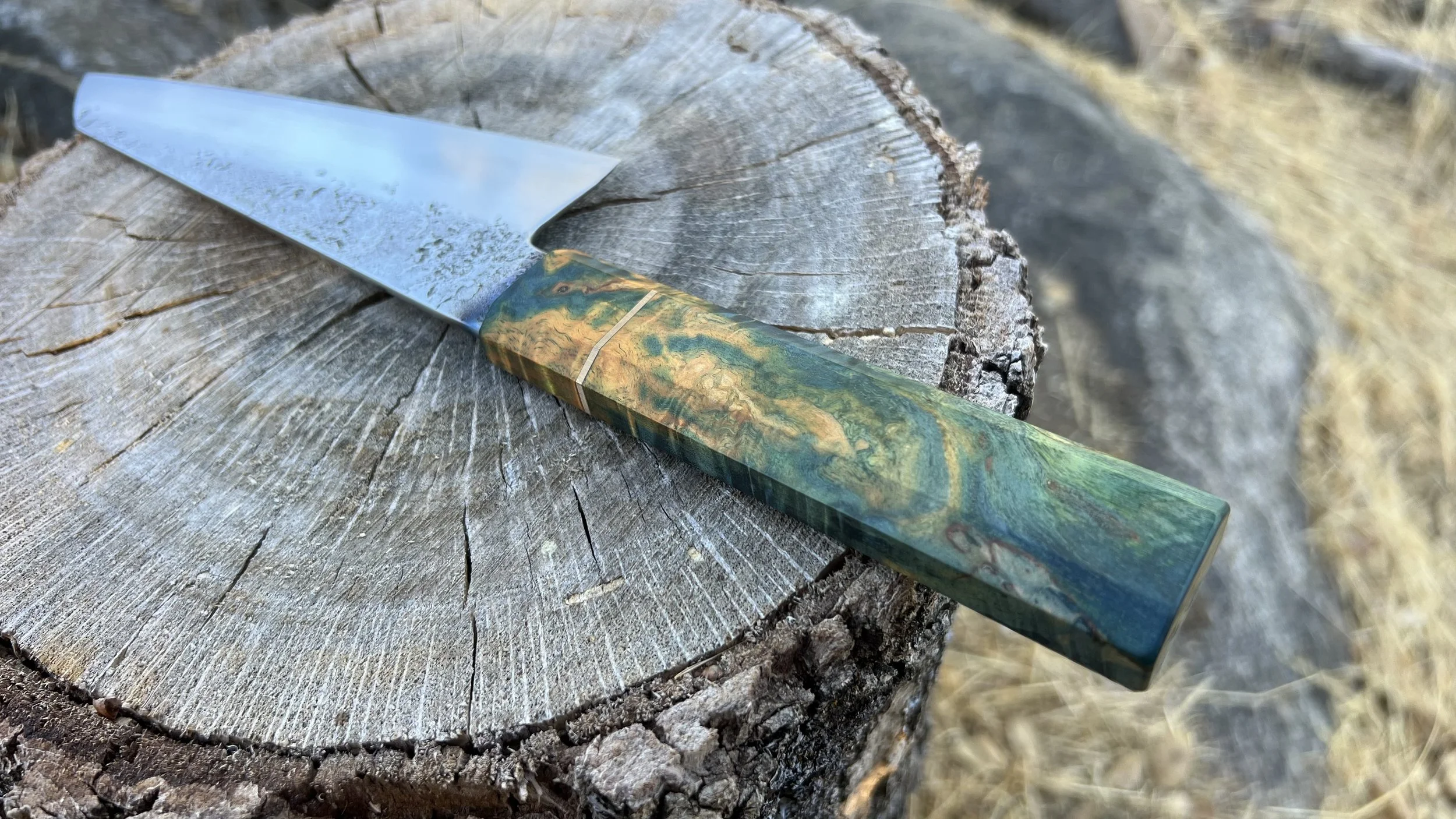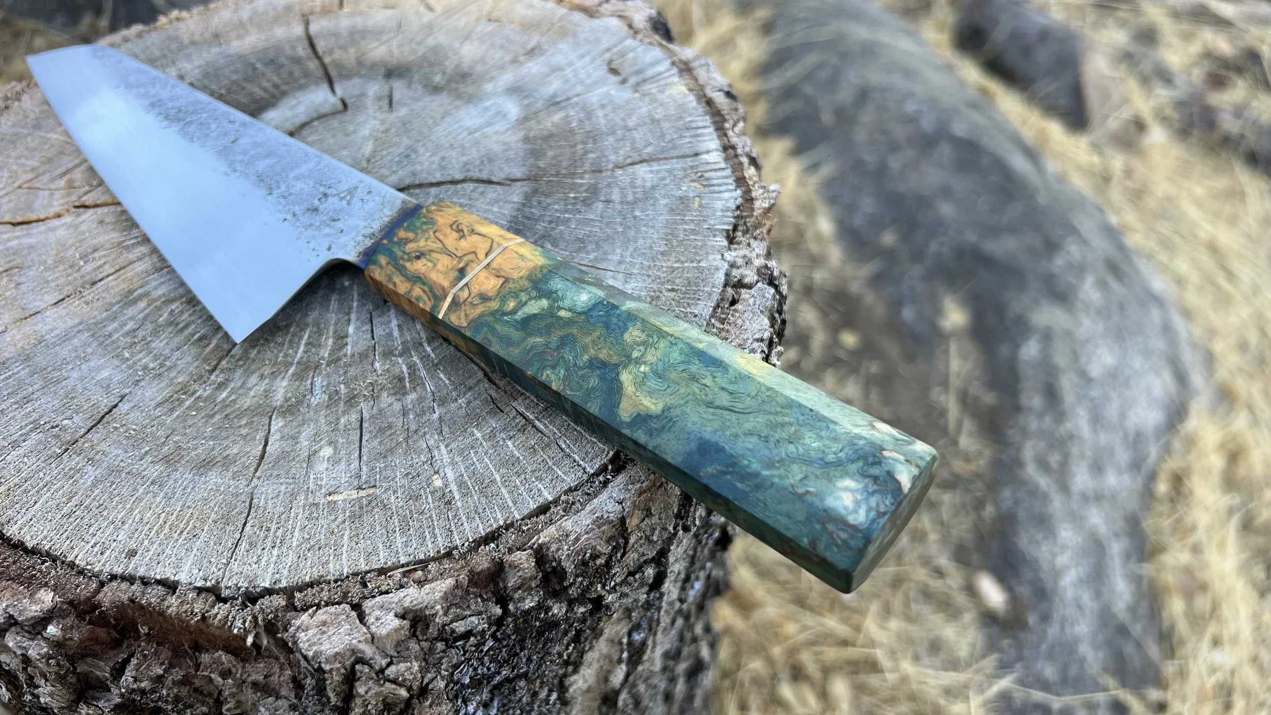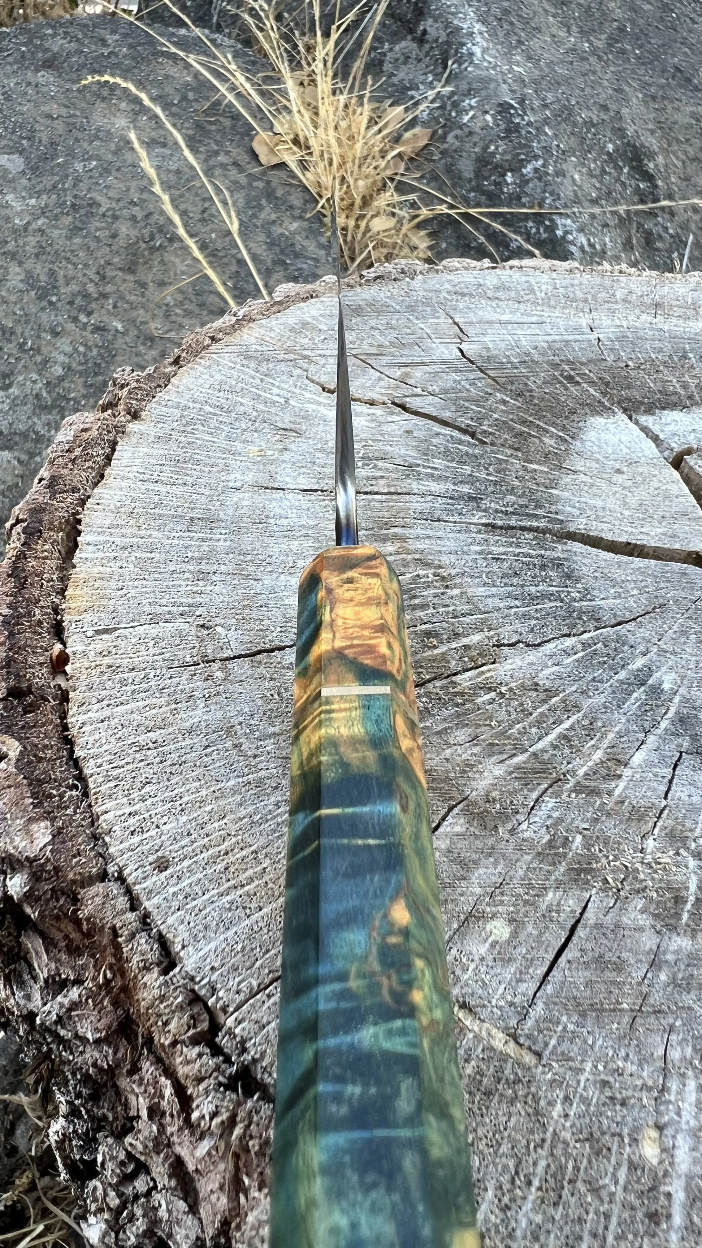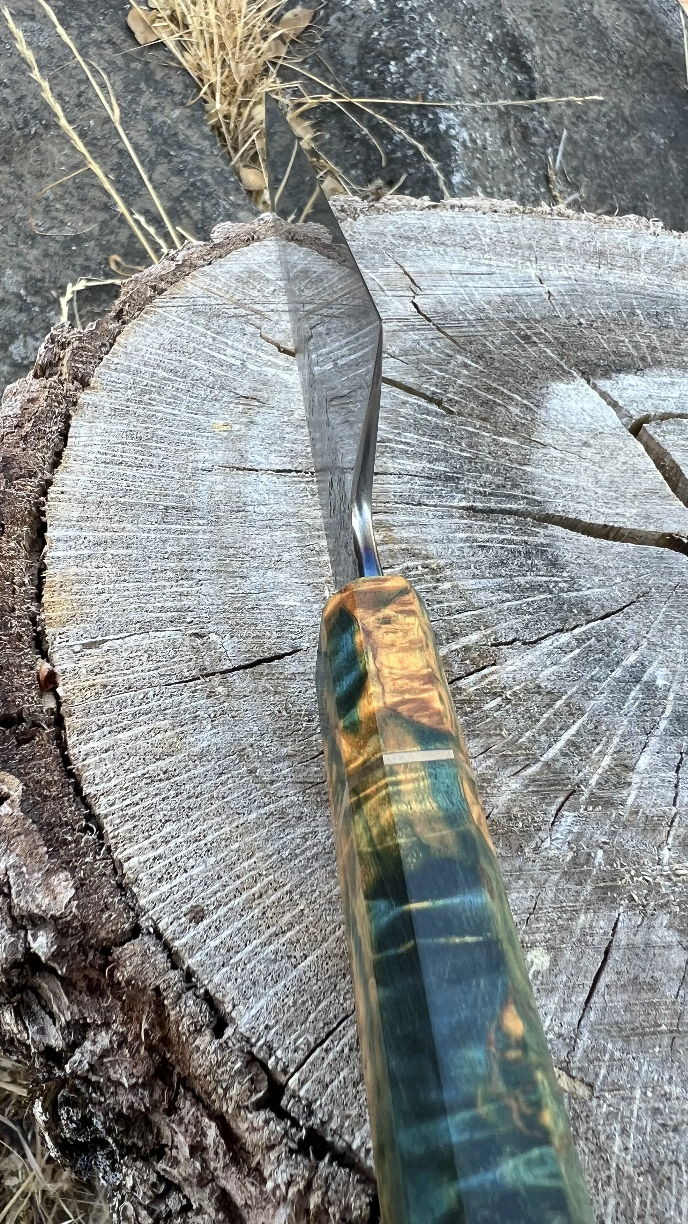 1084 steel, forged finish by the spine, stabilized and dyed birch wood handle.