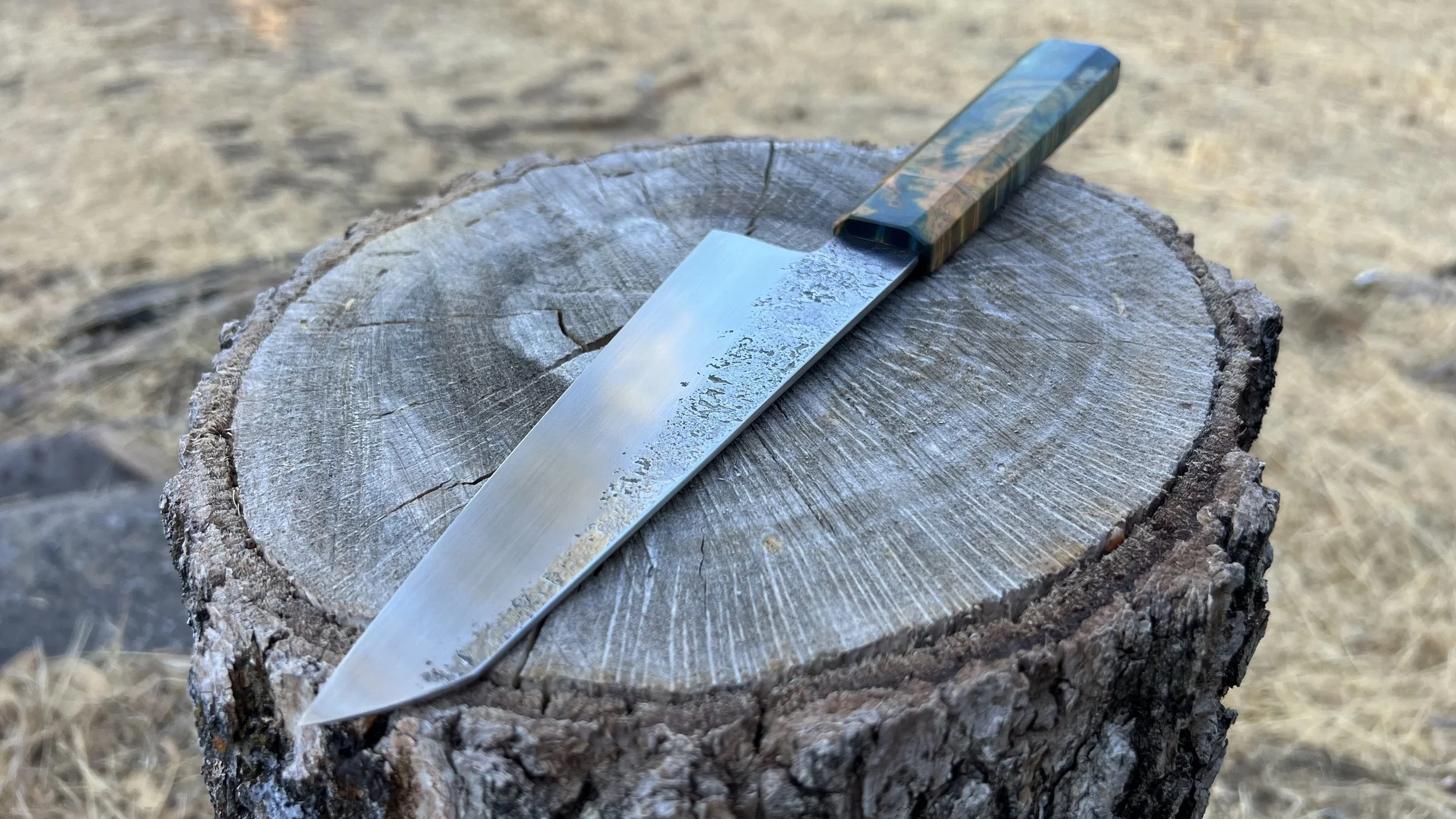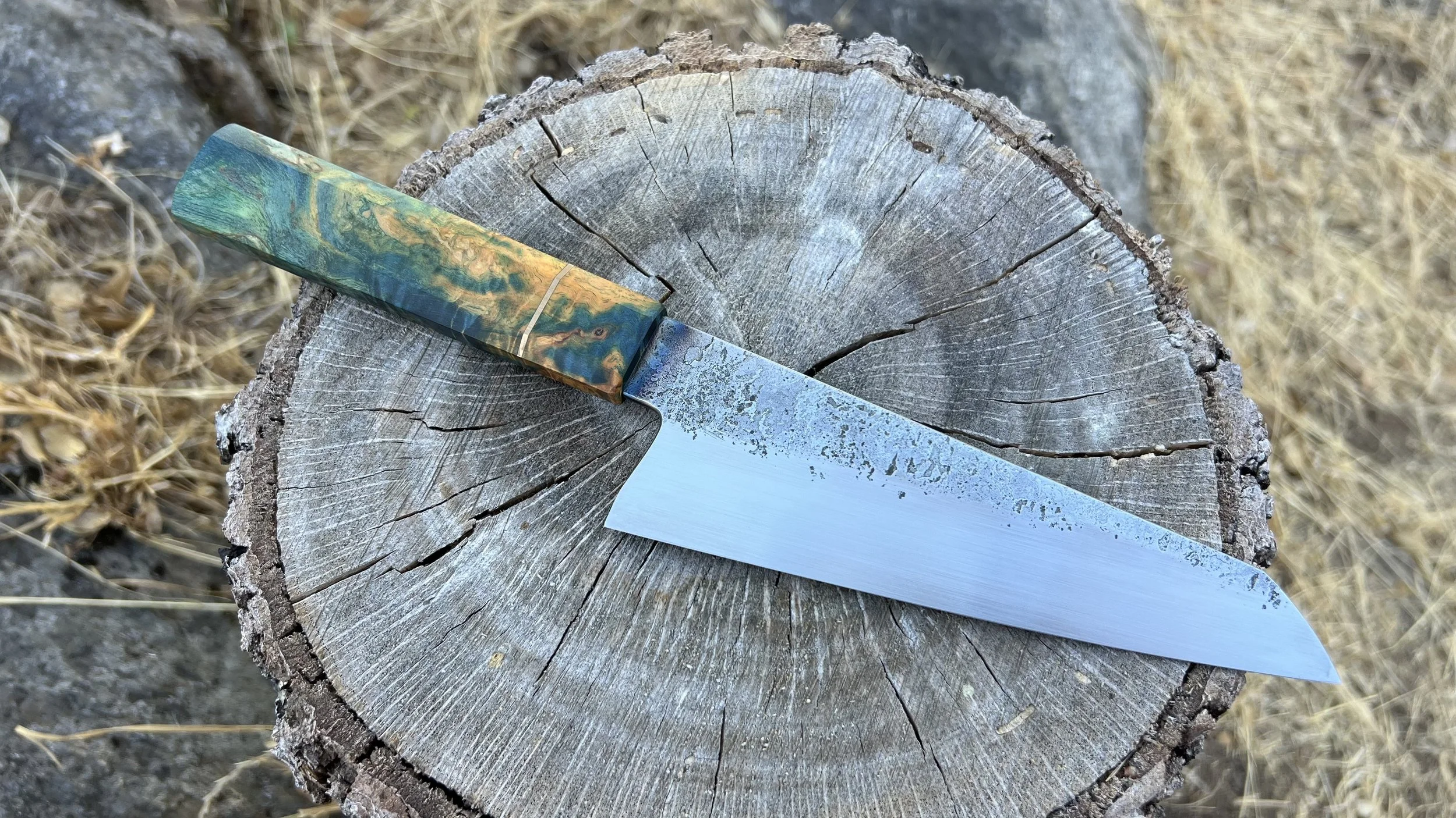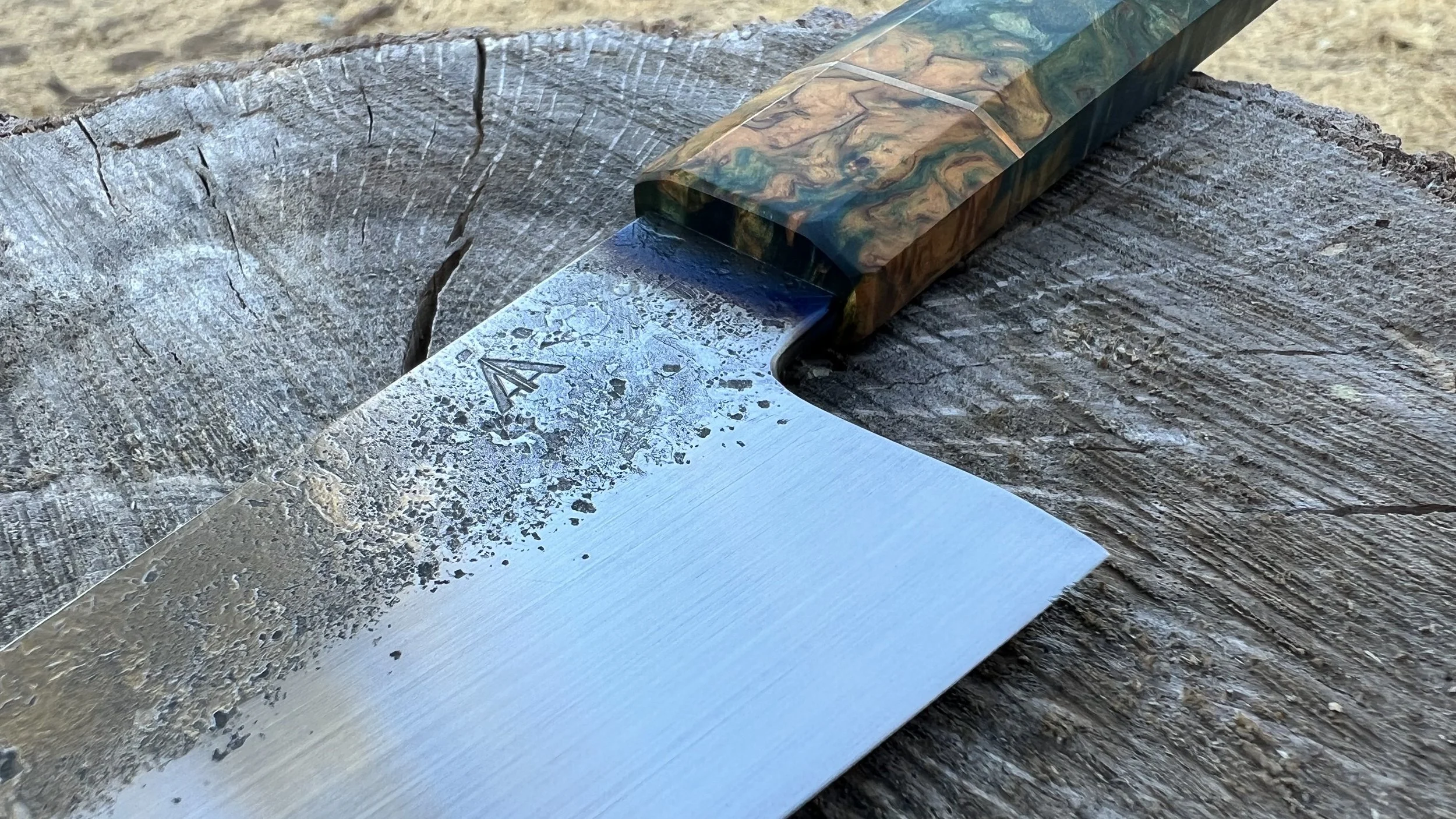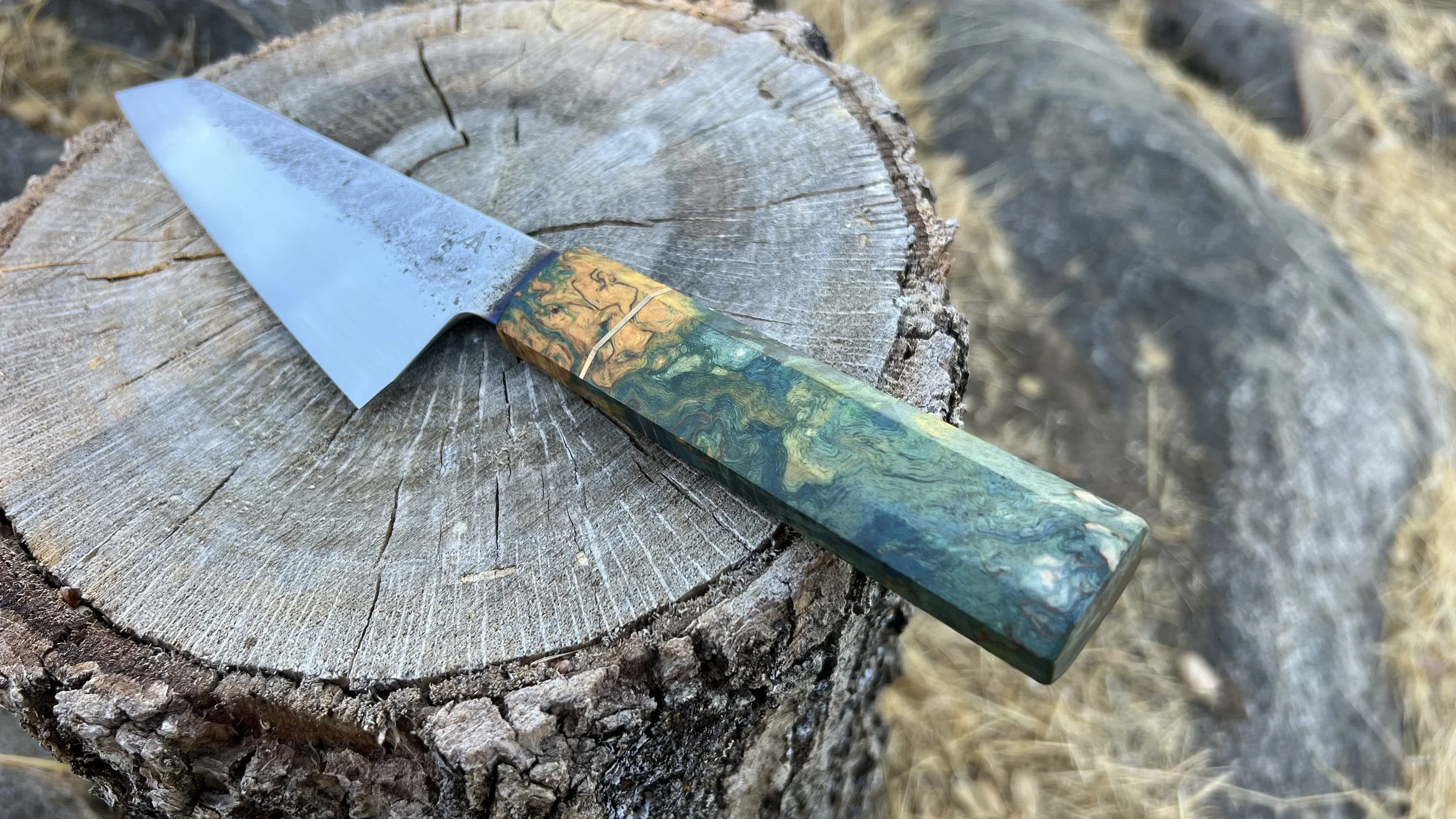 1084 steel, forged finish by the spine, stabilized and dyed birch wood handle.